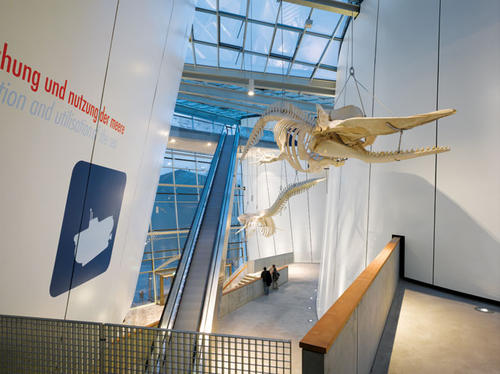 在弧形外壳的里面,有巨大的养鱼缸、由“绿色和平组织”提供的实际尺寸的鲸的模型及关于波罗的海和北海的展览,使参观者沉浸在海洋生活中,同时提醒他们,关心本地环境和气候变化的威胁。