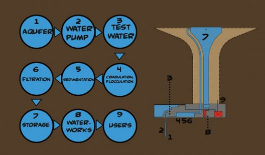 两个类似于“倒立”树的形状,分别为水泵和污水处理中心。