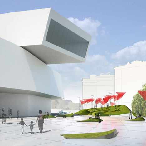 霍尔提出了一个X交叉的构想,使得建筑体量与城市原有的几何关系以及景观结合在一起。建筑本身形成的曲线隐隐与芬兰厅相连,又将海湾延伸引进建筑,为建筑周围未来的发展提供了前提。延伸的水面与各条通过建筑的道路相交织。建筑西边为一个方形水池,可供市民常年使用同时作为建筑与外部大环境的中介。