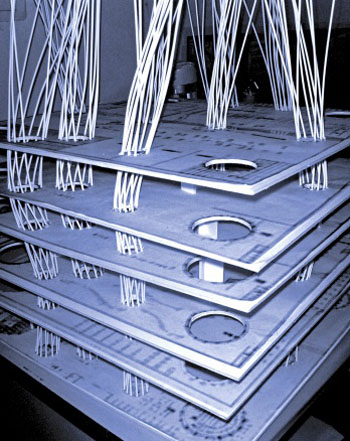 呼吸方式二:树木可以调节气候、净化空气,防风降噪,是氧气的制造厂。而仙台媒体中心内部的类似树木一样的柱体,同样发挥像树木一样的功能,让建筑真正的呼吸。13根管状柱内空气、光线和水相交织,就像充满生命力的有机体,同时各自发挥不同的功能:设置不同管道与配线;柱体内设置功能空间;人们在其中上下走动等。它们就像人体的血管与筋脉,赋予建筑生命。
