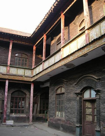 金家大院原来一直被社区房管所占用,还新建了几个办公楼。好在老城改造中,大院是被保留下来的老院落。据记载,金宅建于1910年左右,由4个院落组成,正院前后两进,横列西向三合院两进。现存建筑比较完整的部分,只剩正院中的后院——四合楼还保持着原始风貌。该建筑的北中堂楼上下10间,东西厢楼和南穿堂楼各上下6间,全楼均为玻璃门窗,石制或砖砌拱券门窗套体现出西洋建筑特色。北中堂楼与东西厢楼相接处各设有木楼梯,由此上楼,踩着吱吱嘎嘎响的木地板沿二楼回廊散步,还真怕掉下去。从走廊上可以到达二楼的任何一个房间,但是很窄,仅能容一个人通过,木质柱子红色漆已经掉落开裂。