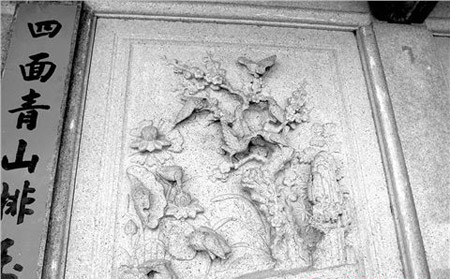 步入正门,只见大门两旁立有两个黑色的扁体石鼓、部分石雕等,其工艺相当精细。正面两边墙壁上镶嵌有完整的“麻雀戏梅”通花石雕,供游人观赏、品味;抬头望去,屋顶为穿斗式、架梁盖瓦的硬山顶结构。