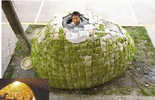 从建筑专业毕业半年的北漂大学生戴海飞,利用公司创意与自己的专业,搭起蛋形小屋,节省房租负担。小屋环保色彩,用竹子、保温膜、防雨膜、麻袋制成,从麻袋缝隙长出的小草点缀着城市,可以移动,通过蓄电蓄水,解决日常基本生活。据称蛋形蜗居造价6427元。