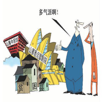 如此,贫困县成了山寨建筑之乡,并不见得有什么出格与夸张。就现实而言,在政绩建筑的风潮里阜宁的山寨建筑并不算得是什么惊人浪费。人们的惊诧不仅源自山寨之名,也在于这些建筑是以何之名矗立起来的。首先,这些寒不可暖贫不可居的建筑,都属于只能远观的景物,如同耗费巨大的奢侈品,的确增添当地一些“洋气”。但是,这如何成了“民生工作”真还是让人丈二和尚——摸不着头脑,就连当地民众被问及受过何种恩惠,也是一头雾水。当地,挂羊头卖狗肉的功夫可谓入了臻境,我代表了民众,民生也就是随意拿捏的橡皮泥。