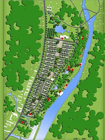 村民住区总体布局上,尽量遵循村庄原有自然生长的空间肌理,同时将传统村落自由、随意的空间与现代空间的秩序化相结合,以达到人工与自然相和谐的意境,更好的满足村民日常行为活动及游客的需要;针对现状用地南北狭长的特征,将住区分为南北两个组团,两个组团之间规划为景观走廊,自西向东与滨水景观带相连;在住区中部规划设计一条南北贯通的步行街(民俗风情街),该街道借鉴传统村落街道的空间构成与比例尺度关系,注重街道空间的转换与收放,合理利用各种空间的变化,设置绿地、铺装及小品设施,供村民及游人使用。同时,结合步行街,在每个组团的中心,规划设置一处小型广场,作为每个组团村民及游人的交流活动中心,该广场向东与滨水景观带相通。