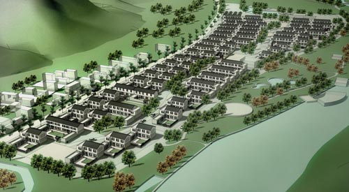 根据用地及周边环境现状特点,新村的主入口设在用地的北部,由过境交通进入新村,绕经用地的东侧向南,由用地的南部出村回到过境交通。这样由一条主环路将整个用地划分成相对独立的三个部分,即主环路环绕的部分为村民住区、住区北部为公共服务区(游客中心)、住区东侧临近白河的区域为滨水景观带。其中村民住区与公共服务区是经过地质踏勘及环评,符合建设条件的用地;滨水景观带则是利用白河护堤规划建设的一处滨水景观带,属于非建设用地。