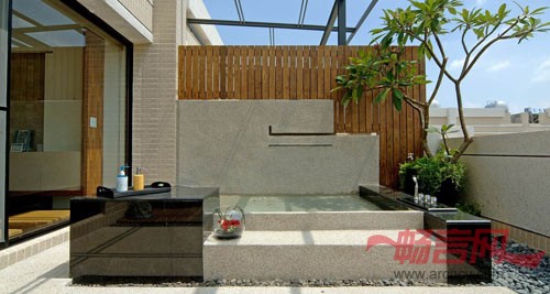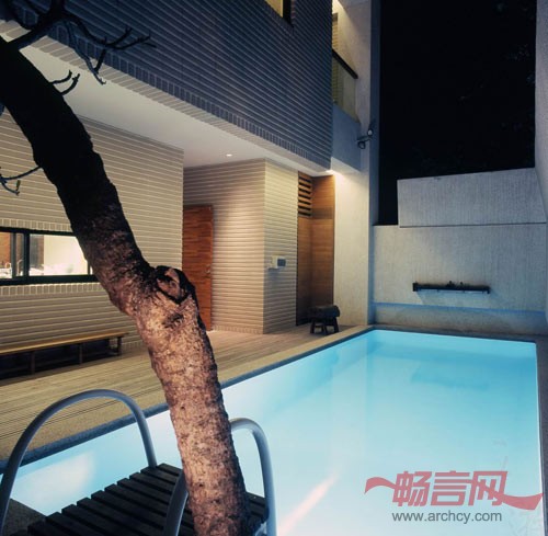 弱化了浴室与泳池的界限。泳池于庭院中,介于室外与室内之间:处于室内,却能感觉到与外面景色紧密相连;置于室外也有高墙可以保证隐私安全