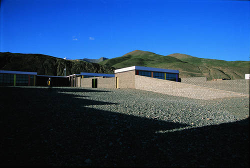 在西藏的宗教圣地神山冈仁波齐峰脚下,有一所用鹅卵石“垒”起来的小学校——阿里苹果小学。远在海拔4800米的西藏塔尔庆(音)乡,建筑师最大限度地利用了当地仅有的建筑材料——卵石,又对当地的太阳能技术加以研究使用,低成本、低能耗地建起了这所满载着西藏孩童求知希望的小学。校舍除了平整的水泥屋顶和正面的太阳能玻璃幕墙外,墙和地面都是由鹅卵石做成的砼砌块垒砌而成。