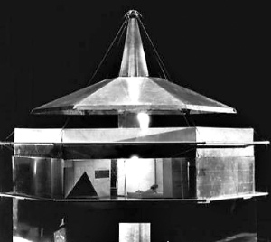 20世纪20年代,他设计出的第一座建筑物是这样的:圆形结构的六面体,用铝和玻璃制成,建筑的中间是一根钢结构的“中央动力柱”,它支撑着头顶上一张拉索网络,建筑的“墙壁”也是这样的拉索网格,网格的表面覆盖着绝缘的双层透明材料。这个建筑有许多独特的功能,比如可以利用太阳能发电,设有电视、自动真空吸尘系统、空气调节和自动开关的门(这些在当时都还没有发明出来)。同时这个建筑还很轻便,悬浮于空中的飞艇可以钩住房子的吊索,将它带到任何地方……1920年,这一建筑模型在芝加哥展出,轰动一时,但也只是轰动一时而已。没有人认为这种房子真的能够被建造出来,而富勒也只不过是个“无害的怪人”而已。