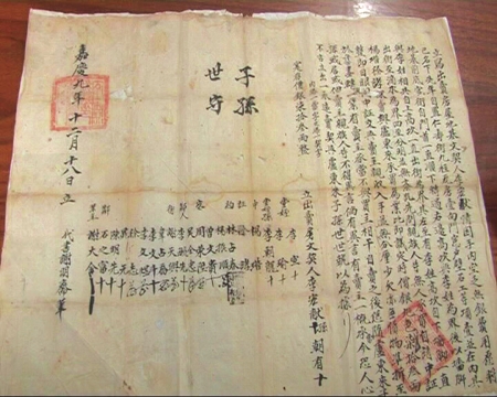 界、成交价格等条款,而且还有卖房人儿孙、堂侄、邻居等十多位见证人的签字画押。