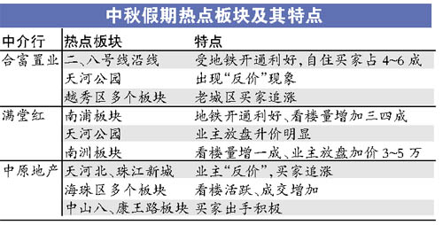 中原地产和合富置业的报告均显示,小长假期间,虽然个别板块相对活跃,但是整体市场状况较为平淡。而满堂红地产的统计数据却显示,中秋假期成交量同比增加2.6倍,均价同比增20.1%。有中介行人员透露,合富置业在全力销售亚运城,导致二手楼客源流向其他中介行。