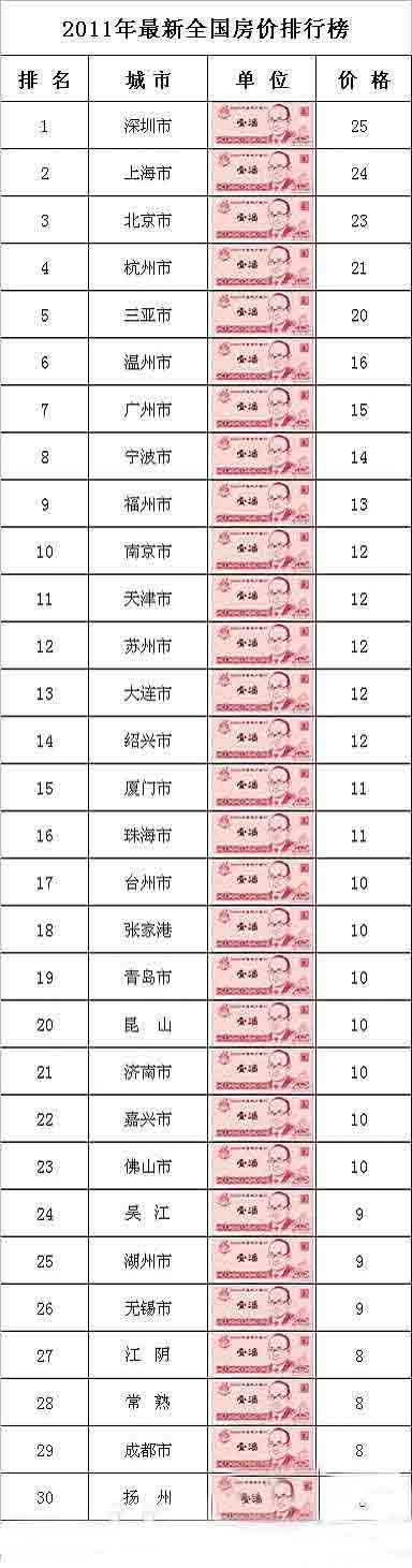 新浪房产迅速把各地的房价,换算成了“潘”价,排列出“2011全国最新房价排行榜”,深圳以25潘的价格,高居榜首,广州以15潘位列第七。