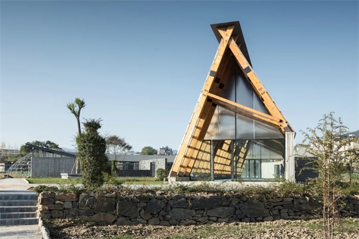 在竹溪县龙坝镇,一条新的市政道路“长龙大道”以30度的切角与原有乡镇的的主入口交叉而过,在与原有乡镇的主干道之间的三角形地块,便是草莓园活动馆和