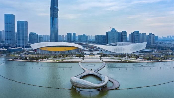 苏州湾文化中心坐落在太湖之滨、毗邻太湖新城中央商务区,预计将于今年12月开幕。这座现代化大型综合体以夺目的“双飘带”建筑造型树立了湖区时代的文艺