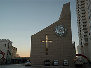 黑河基督教堂的空间根据功能和形象的需要,西南角高高升起,屋顶坡折,外形仿佛一只将要展翅上腾的鸽子。圣经中鸽子寓意圣灵降下,带来了平安喜乐,此时教