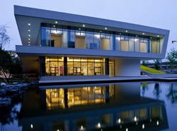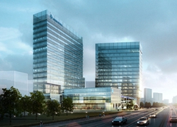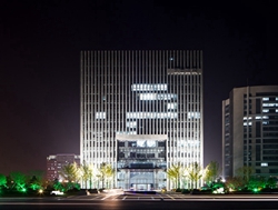建筑形象依据构思自然生成,整体而独具特色。立面处理上,我们在竖向石材构件和玻璃幕墙之间寻求宜人的比例关系,其色彩对比强烈,在阳光下呈现明晰的光影