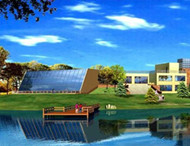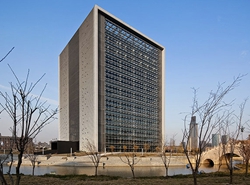 图书馆位于浙江学院校区东西向主轴线正中的一块由环路围绕的圆形场地上,西侧正对校园主入口,南侧及东侧有河道蜿蜒而过,并通过两座桥梁与对岸相连。图书