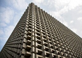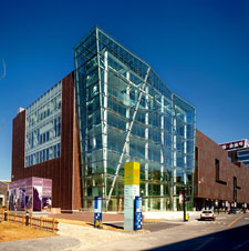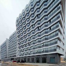 这个公寓办公集合体的体量分成了四块,一个底座和上面三个起伏的体块,清晰地反映出内容的不同:底座是商业,上面一块是办公体块;另两个公寓体块分属于两