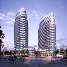 此项目南面临长城,背面紧贴公园,具有非常好的景观朝向。基地占地较小,通过景观朝向和两塔楼对视距离最大化的研究,我们得出这样的两个月牙形的塔楼。