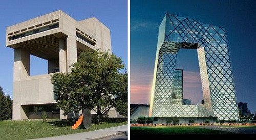 央视新楼的设计师库哈斯披露了设计思想:男女生殖崇拜,“主楼是一个女性的臀部朝外趴着,副楼就是与之对应的男根”。这下可好,礼仪之邦的中国几乎炸锅;