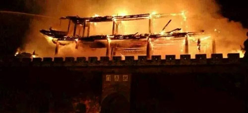 2015年1月3日凌晨三点左右,修建于明朝洪武年间的巍山古城楼起火,雄伟的古楼建筑被毁,目前起火原因不详。据介绍,云南巍山古城拱辰楼原为蒙化卫城