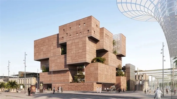 OUALALOU + CHOI事务所分享了摩洛哥馆的新形象。该建筑由22个堆叠体块组成,占地4000平方米,33米高的夯土立面显得十分庞大。项目
