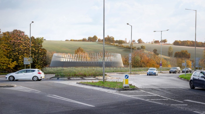 Grimshaw事务所设计的英国高铁2号项目中,装饰性屋顶和弯曲耐候钢墙将Amersham通风井围合起来。项目坐落于英格兰Amersham交叉路