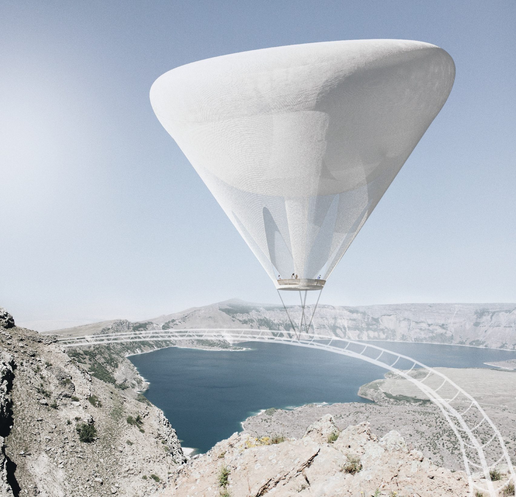 项目位于土耳其东部一座火山口,是一座概念观景平台。主办方举行了设计竞赛,该获胜方案包含一座系在悬挑梁上的氦气球。火山眼竞赛由Bee Breede
