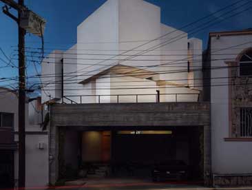 一群白色的建筑结构从墨西哥蒙特雷的一座住宅的黑色混凝土入口上方矗立,该项目由Arquidromo事务所设计。云屋坐落于一块长方形场地上,此前是该