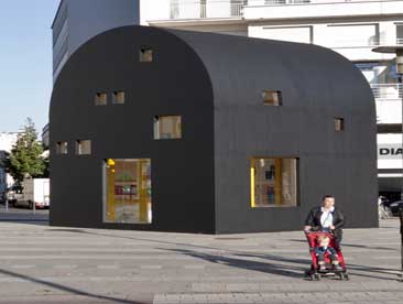 2A+P/A工作室设计的该项目将意大利著名建筑师埃托·索特萨斯的绘图转变成建筑。项目位于铺有广场砖的道路上方,呈现出深色、粗粝、内敛的形态,除了
