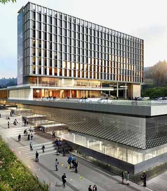 SAMOO事务所赢得了蔚山政府综合办公楼设计竞赛的优胜。项目方案充分利用了山麓坡地的场地特点,创造了不同高度的楼面,方便用户的使用。底层裙楼方便