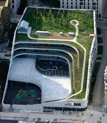 Chartier Dalix建筑事务所在巴黎西面郊区完成了一所小学的设计工作。这所小学构想为“空中景观”,设有屋顶绿化,将自然环境引入城市肌理中