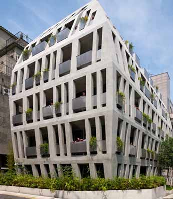 Archium工作室设计的韩国首尔Gilmosery办公楼具有弓形混凝土外立面和金属穿孔板阳台。该设计使得建筑中间楼层楼面面积较大。韩国建筑师K