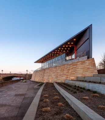 该广场加场馆项目面积为2200平方英尺,占据了美国爱荷华州Des Moines市中心Des Moines河岸的醒目地段。建筑是新建主河道项目的重