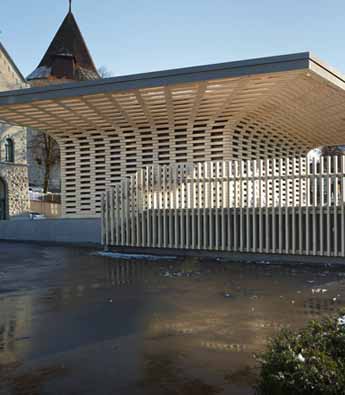 Ramser Schmid Architekten建筑事务所设计的瑞士楚格城市公园展馆位于市图书馆一侧,为游客提供了具有遮蔽的户外座位区。该设计