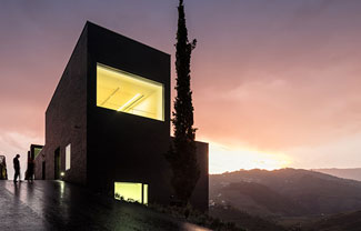 Baixo Corgo葡萄酒庄游客中心坐落于一片俯瞰葡萄园的山地,外层覆盖了黑色砖块,最大程度缩小对于环境的影响。建筑一侧是一条马路,走向曲折,