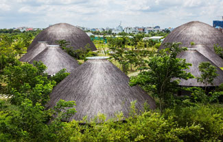 武重义建筑事务所设计了位于胡志明市钻石岛的社区中心。项目包含8座大小各异的竹屋,拥有多功能作用,一侧流淌着西贡河。建筑包含夸张的茅草穹顶,自然结