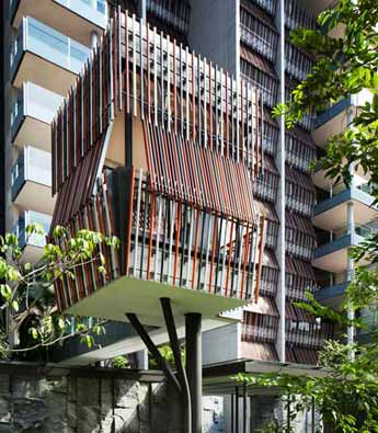 WOHA建筑事务所设计了新加坡Goodwood公寓,公寓位于树干形桩基之上,为住户提供了户外空间。项目包含210套公寓,围绕中央庭院而设,浓密的