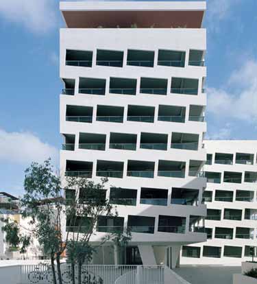 项目位于法国蒙彼利埃,包含两座多层住宅建筑。建筑拥有双层表皮,营造出倾斜的窗户。项目由ECDM公司设计,围绕共同的混凝土基座展开,那里容纳了行人