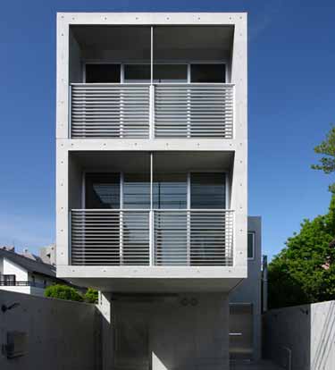 项目位于东京市中心以西的Minamikarasuyama,日本HAKO建筑事务所在独栋建筑中设计了两套住宅。建筑外墙混凝土板上具有若干凹陷,两座