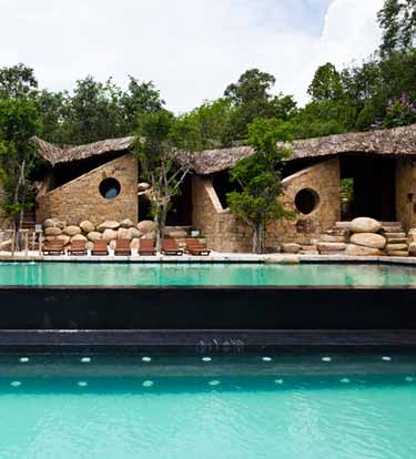 A21Studio设计工作室设计了位于越南Nha Trang的度假酒店增建项目。项目为九个具有茅草屋顶的石质小屋,掩映在I-Resort酒店的纯