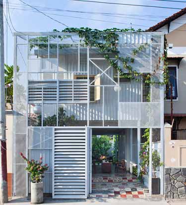 越南A21 Studio工作室为一栋位于Binh Duong省的住宅进行了建筑设计。金属梁、波纹板组成的格栅立面上攀爬了许多植物和藤蔓。项目的预