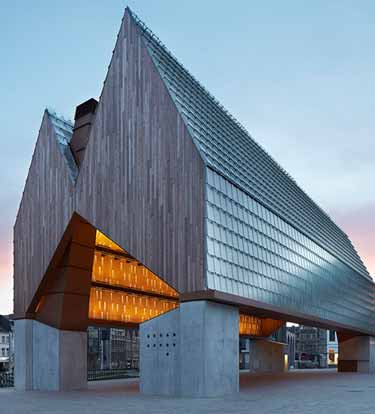 比利时根特城市中心集市厅由Robbrecht en Daem和Marie-Jose Van Hee共同设计,建筑的双三角墙和混凝土结构参考了附近