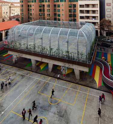 学校庭院使针对教学时间的休闲、课外活动和上下学时段接送学生的家长聚集场所。不同的活动属性要求不同的空间组织方法,通常不同功能方案会产生相互干扰。