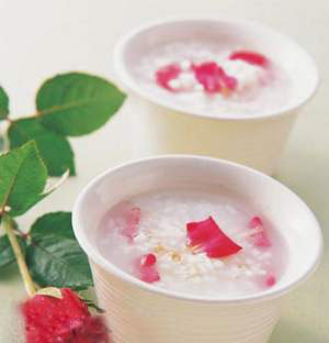做法:将大米淘洗干净,放入锅中加适量的水,再放入干玫瑰花蕾一同煮粥,30分钟后即可食用。
