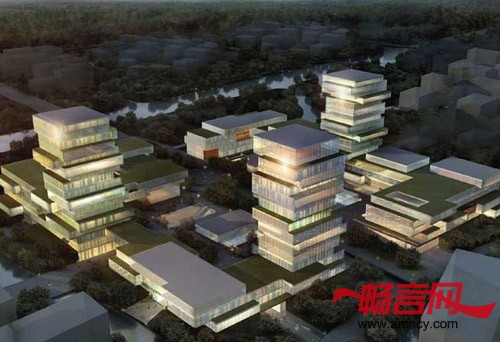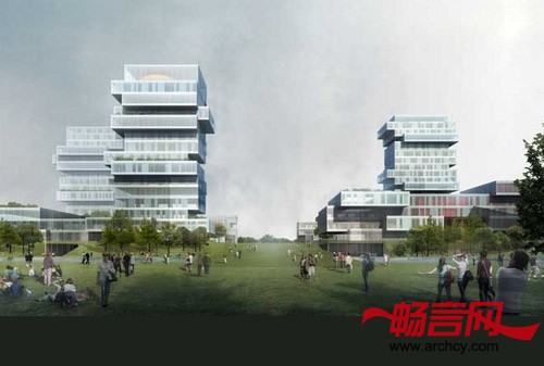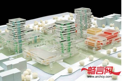 六大功能板块沿基地四个角边形成包含三座塔楼的4组建筑。建筑灵感来自堆叠的书籍,立面特征是矩形“书籍”堆叠形成雕塑风格的建筑体型。