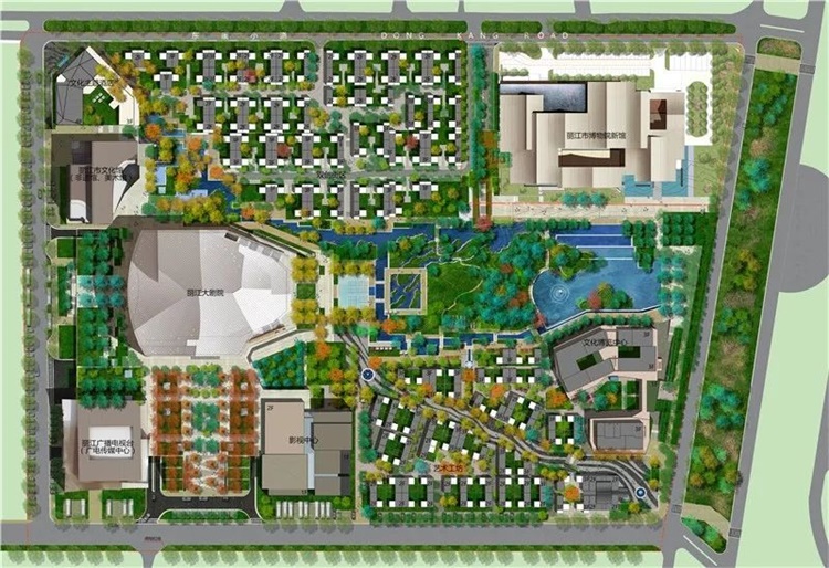 大剧院的西南侧依次布置丽江市文化馆、广电传媒中心和影视中心,开放的广场空间与周边的文化建筑属性,界定出典雅的文化会议片区。艺术工坊与文化博览中心沿南侧道路横向展开,北侧面向中心湖滨湖开放空间,南侧连接金茂住宅区。工坊形式将绵长的东西界面打通,结合业态分布,使不同功能层层叠加,犹如多宝格架般展现出丽江的独特文化魅力,文博中心则集合影院、商铺、特色零售等业态,驱动小镇运营的活力。