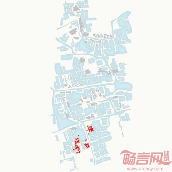 尊重第三自然——原有散落、具有浪漫气息的村落肌理及原有道路。新规划建筑以原有村落宅基地为基础,采取功能群组分散原则,以形成各地块自成体系又足够“离散”的多中心聚落;充分利用原有小桥、巷道、田间小径,作为主要的人行步道,重构西溪固有的隐逸风骨和水乡形态。