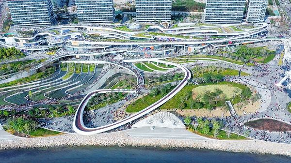 起伏的绿色屋顶的分层将庞大的开发项目的各个部分联系在一起。屋顶为游客创造了面向海洋的观景平台。多样化的景观:包括一个花圃、一个层叠的雕塑花园、一个户外表演平台和一条跑步路径。小径悬挂在零售区的上方,为跑步者提供了横跨公园、面向城市和广阔海洋的全景视野。
