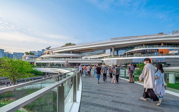 建筑师详细介绍了零售公园开发的可持续元素:“贯穿东西两岸零售街区的生态绿化带将水景和绿色植物引入商业空间,景观和建筑自然融合。伴随着遮阳棚、绿色阳台和生态屋顶,形成空气循环,大大降低了城市热岛效应。